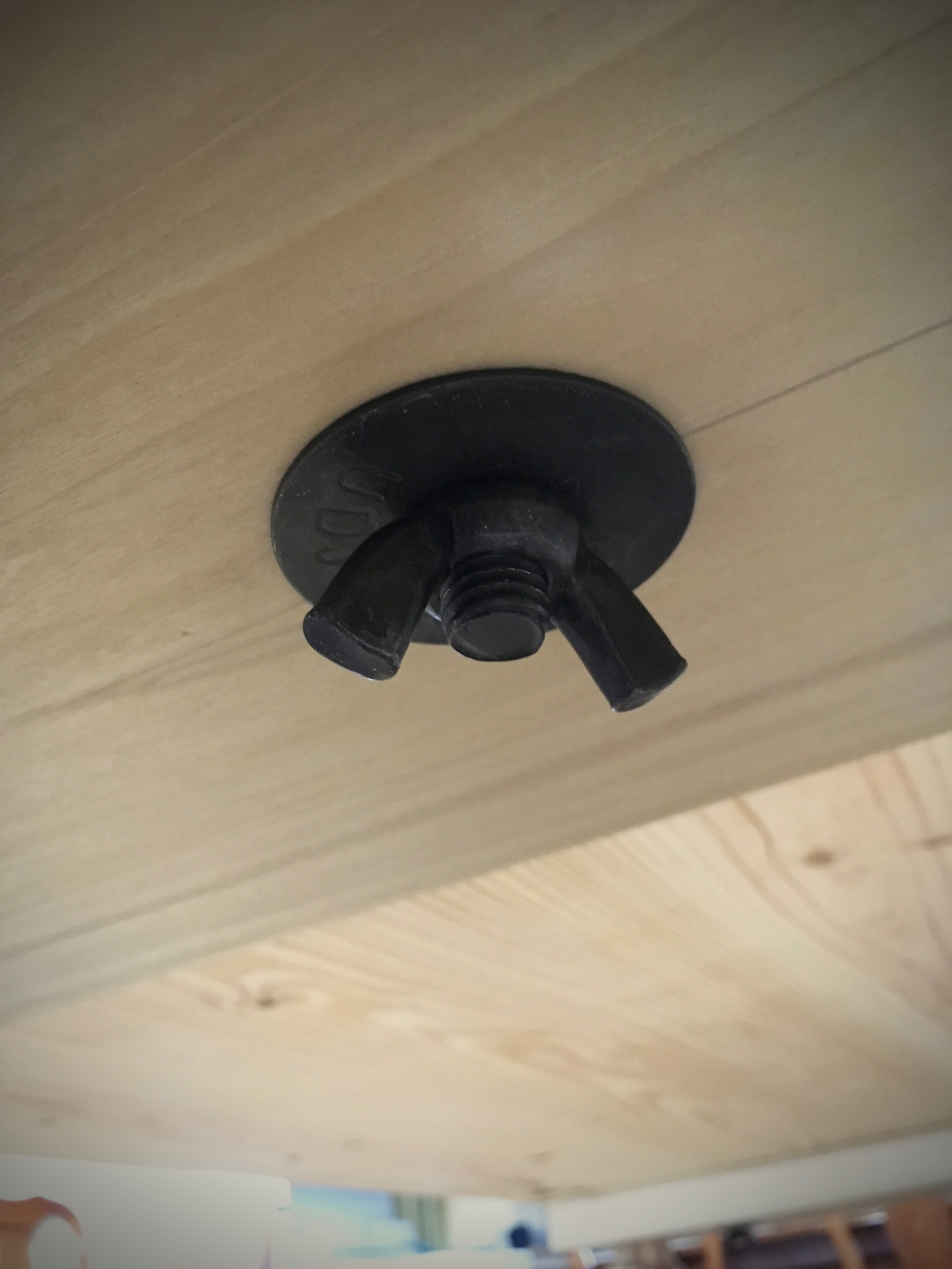 I mounted the top with the carriage bolts and wing nuts that I “aged”. Two bolts per trestle. These are 1/2″ bolts and I needed to allow for any expansion and contraction of the top. To do this I bored 3/4″ holes in the trestles. Hence the need for a fender washer. The tabletop received a countersink for the bolt head and a 1/2″ thru hole. To create the countersink I employed my expansion bit and cleaned up the bottom of the hole with a small router plane.