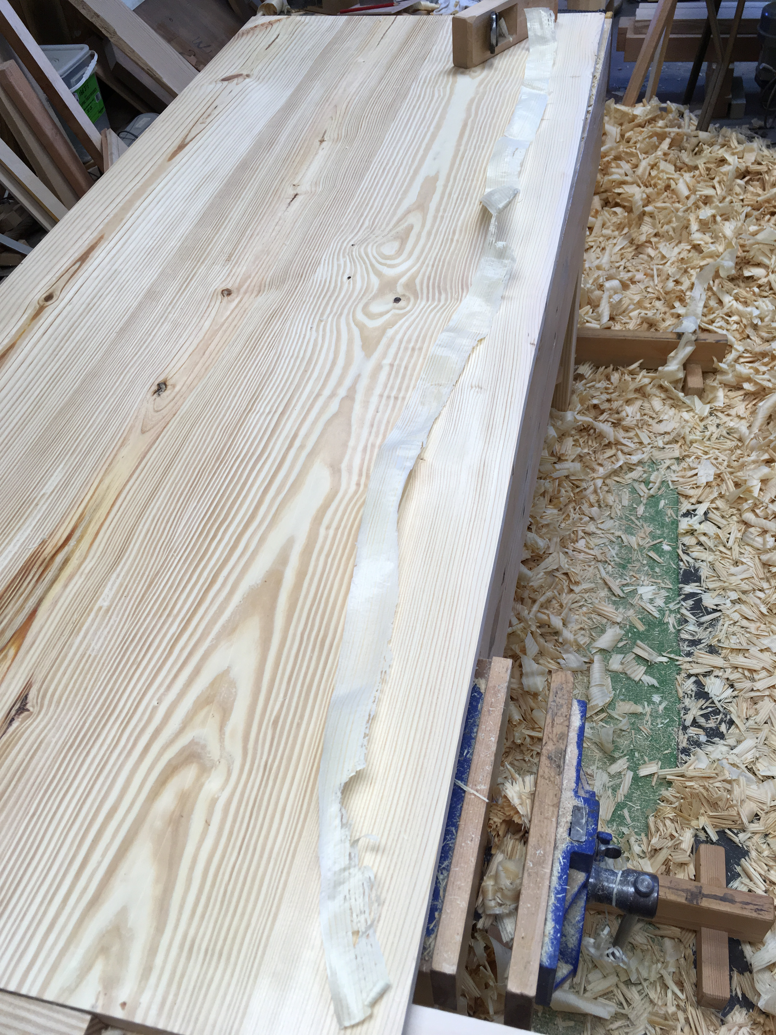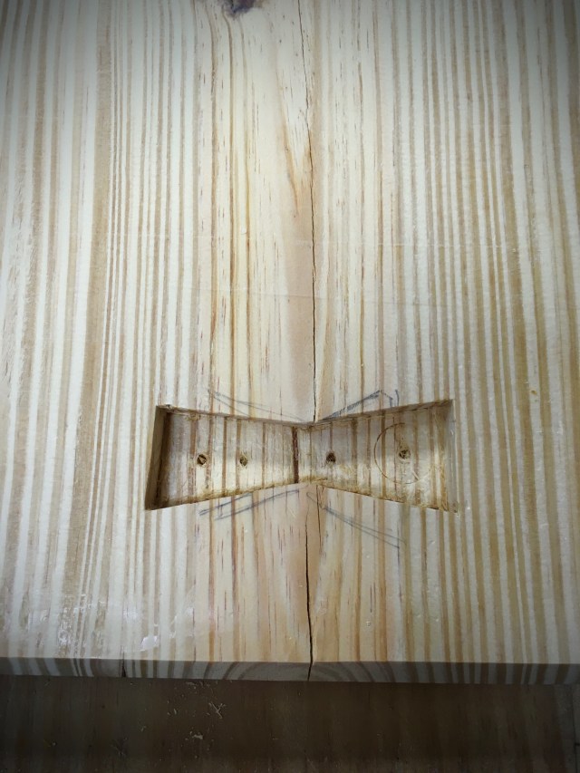 Once it was flat, I trimmed it for width, length and mitered the corners. Then I planed a wide chamfer on all of the edges. One issue was that a small check had opened up at one end on the bottom face. This occurrence was not unexpected. I’m using construction grade SYP for this top. All of these pieces were cut close to or contain the center of the log. The offending board contained a center portion of the log and the pith that comes with it. No big deal, I had been wanting to try inlaying dutchman patches anyway.