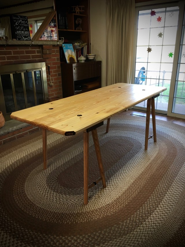 Finally!  After days of applying finish and buffing, these two staked dining tables are finally complete!  This project started as a simple idea from the “The Anarchist’s Design Book” for two easily moved “knock-down” tables.  That simple idea became a wealth of experience and learning.  I truly learned a lot while building these trestles and the accompanying tops.