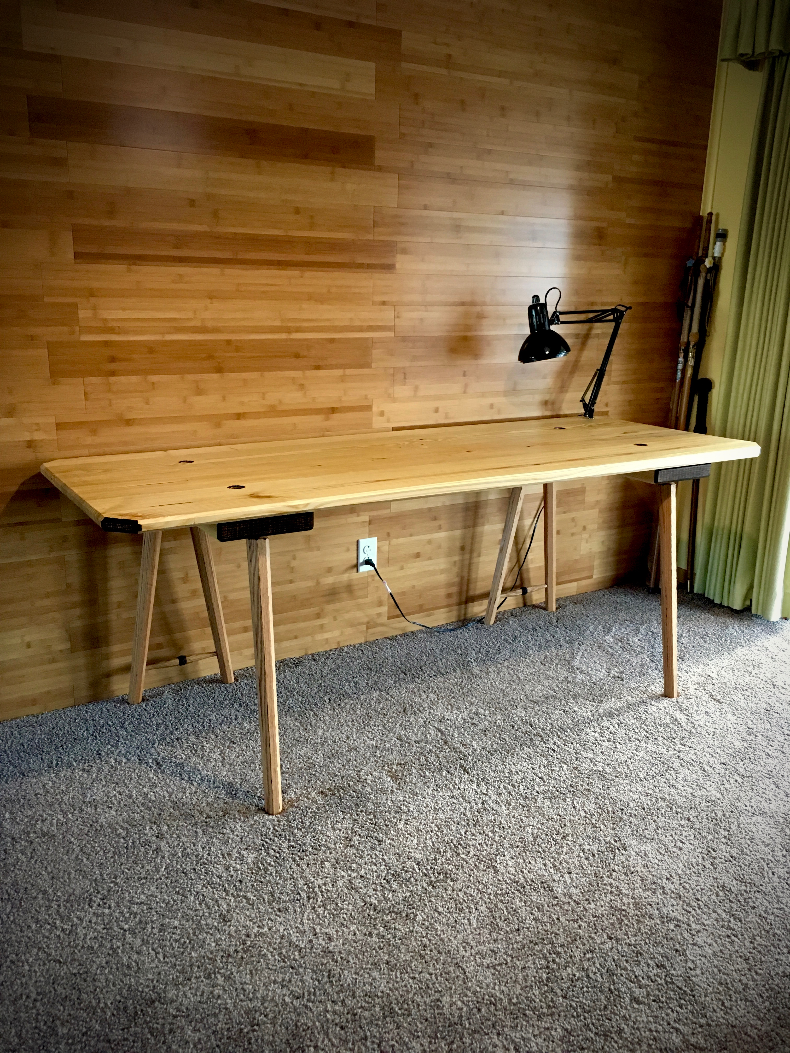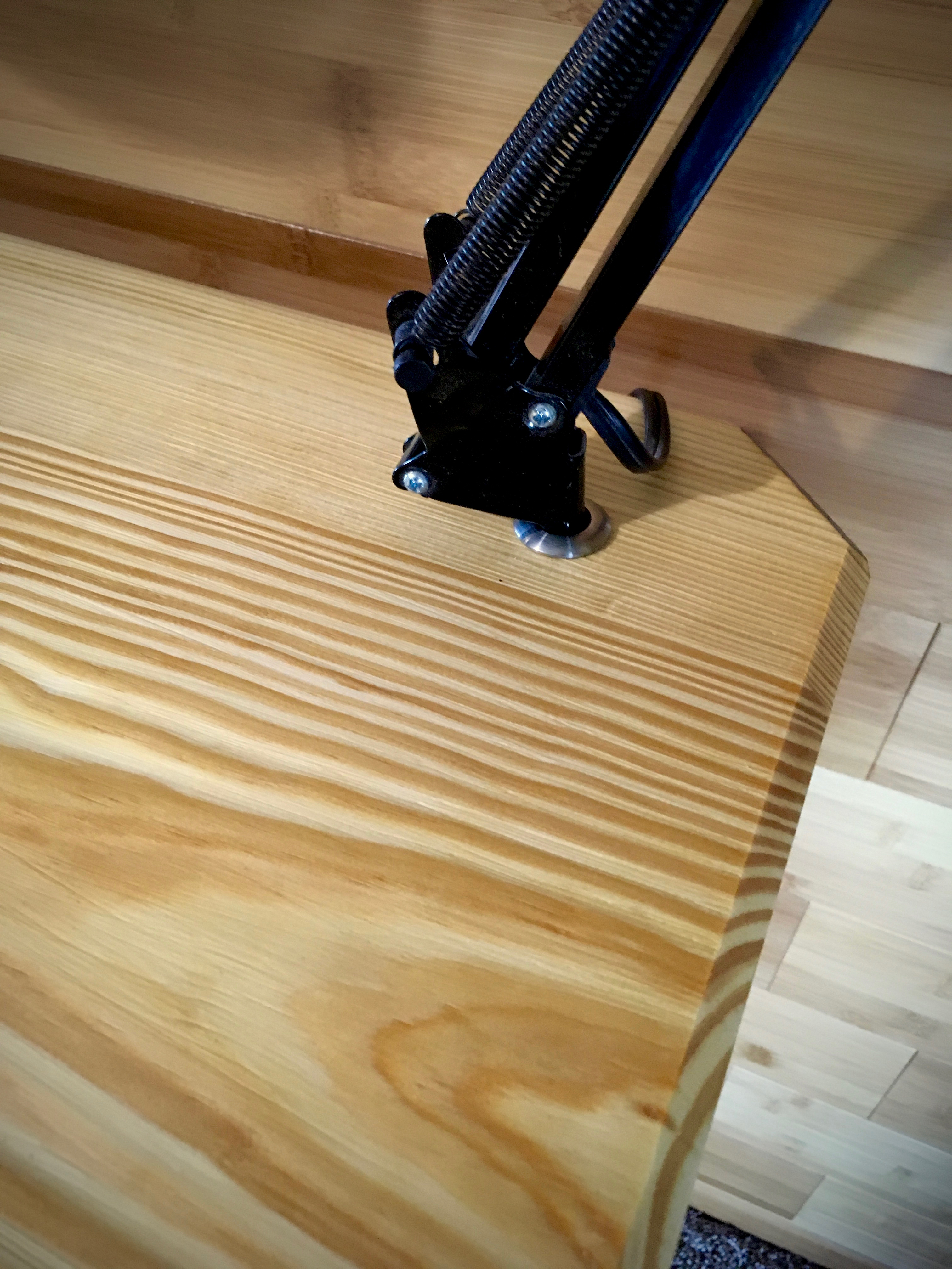 The spare table will live most of its life as a work/craft table.  To enhance that function I drilled a hole and added a Lee Valley lamp bushing at one corner to hold an articulating lamp.  I still need to get a desk blotter to round out the look and utility.