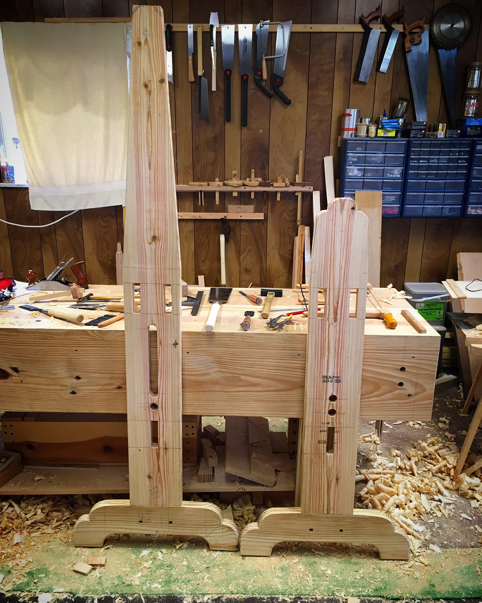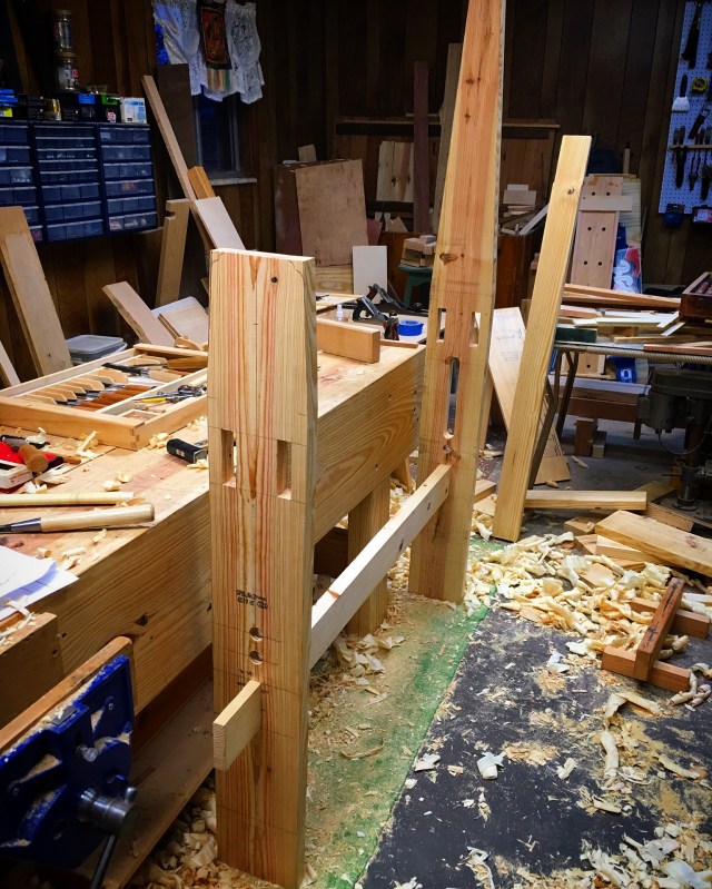 Tomorrow I’ll chop the mortices in the rail tenons and fit the wedges.  I also hope to clean up the uprights and feet with a plane and assemble them.