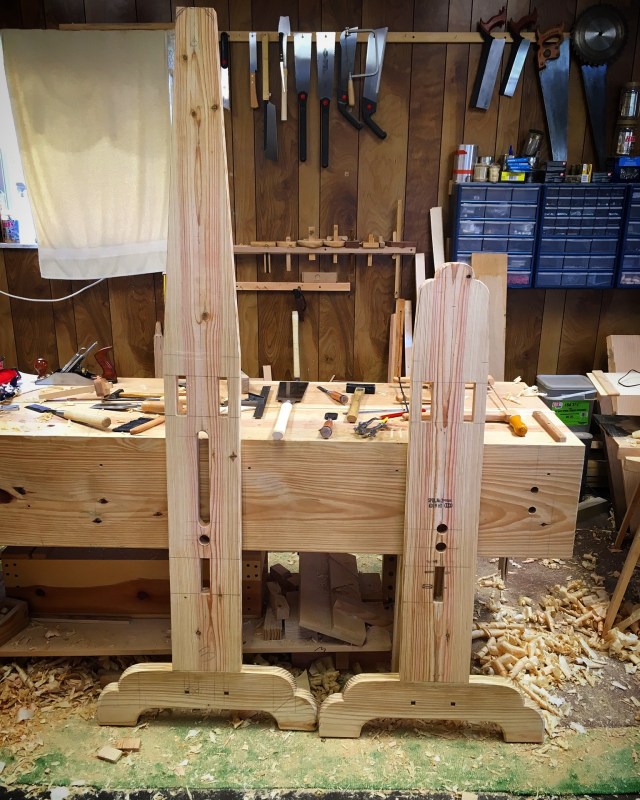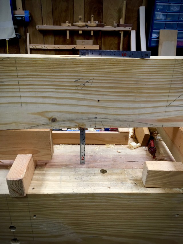 I’m shaping the feet with a Japanese inspired shape.  My original plan was to have a shallow arch at the bottom center of the foot.  (This is why I should have waited on locating the square pegs). I saw that I had a couple of knots in these pieces, no big deal.  What I hadn’t noticed is that one of them was dead and loose.  I saw that I could eliminate the knots by changing the shallow arc to a deeper shape.  Ideally the drawbore pins would be closer to the shoulder of the tenon than to the end of the tenon.  Changing the shape of the cutout will shift my pins about 12mm(1/2″) closer to the end of the tenon.  Not a big problem, I’ll just have to lessen the offset so as not to over stress the tenon.