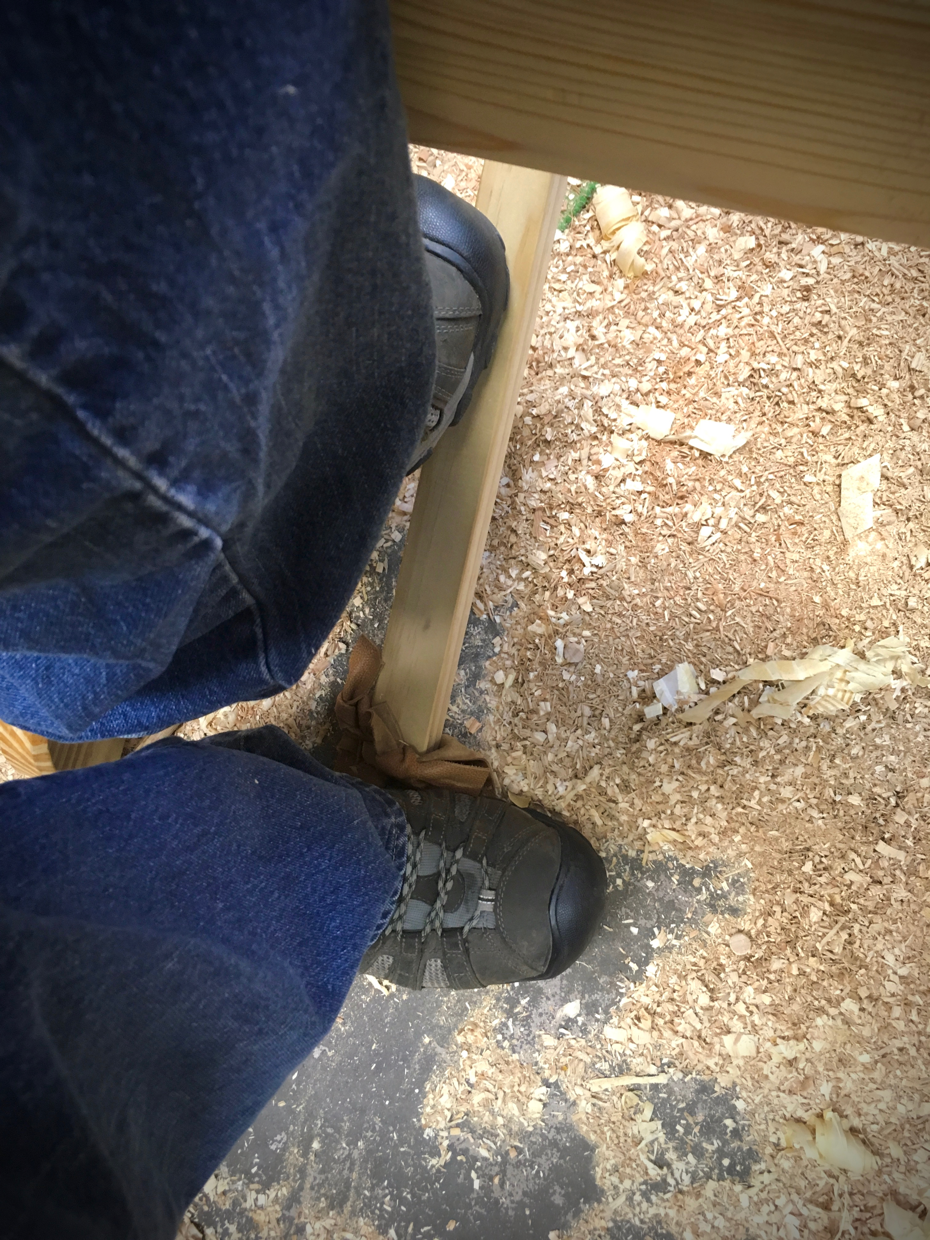 The problem is keeping the thing in place during use. In use you place your stationary foot at the pivoting end of the foot/treadle board and pump away with your other foot. What I found is that the thing tends to walk away during use unless you have the perfect angle of push with your other foot. I found it quite frustrating to chase the thing around. I needed a simple way of keeping it in place. Another issue was that the return was a bit sluggish no matter the tension on the springs. This told me that the foot/treadle board was simply too heavy (see photo above).