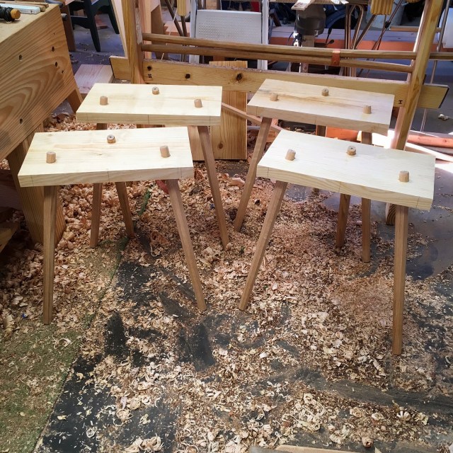 Soon enough I had all of the joinery for the four stools completed. Note that I added Turks head knots to the front stretchers.