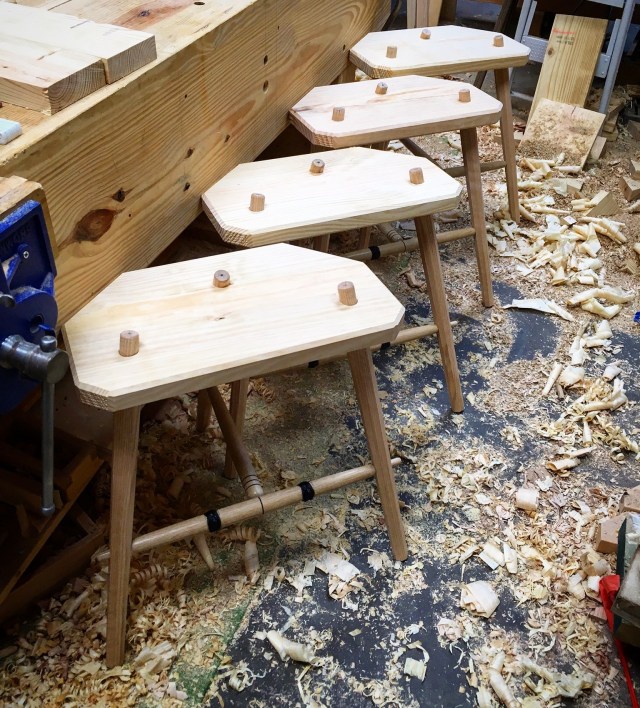 Like Matt, I was wondering about glue up on these. Did you loose fit the stretchers in the three legs and work the legs into the seat all at once, a little at a time, or did the legs have enough play that before being run home and wedged that you could splay the legs out to get the stretchers in place?