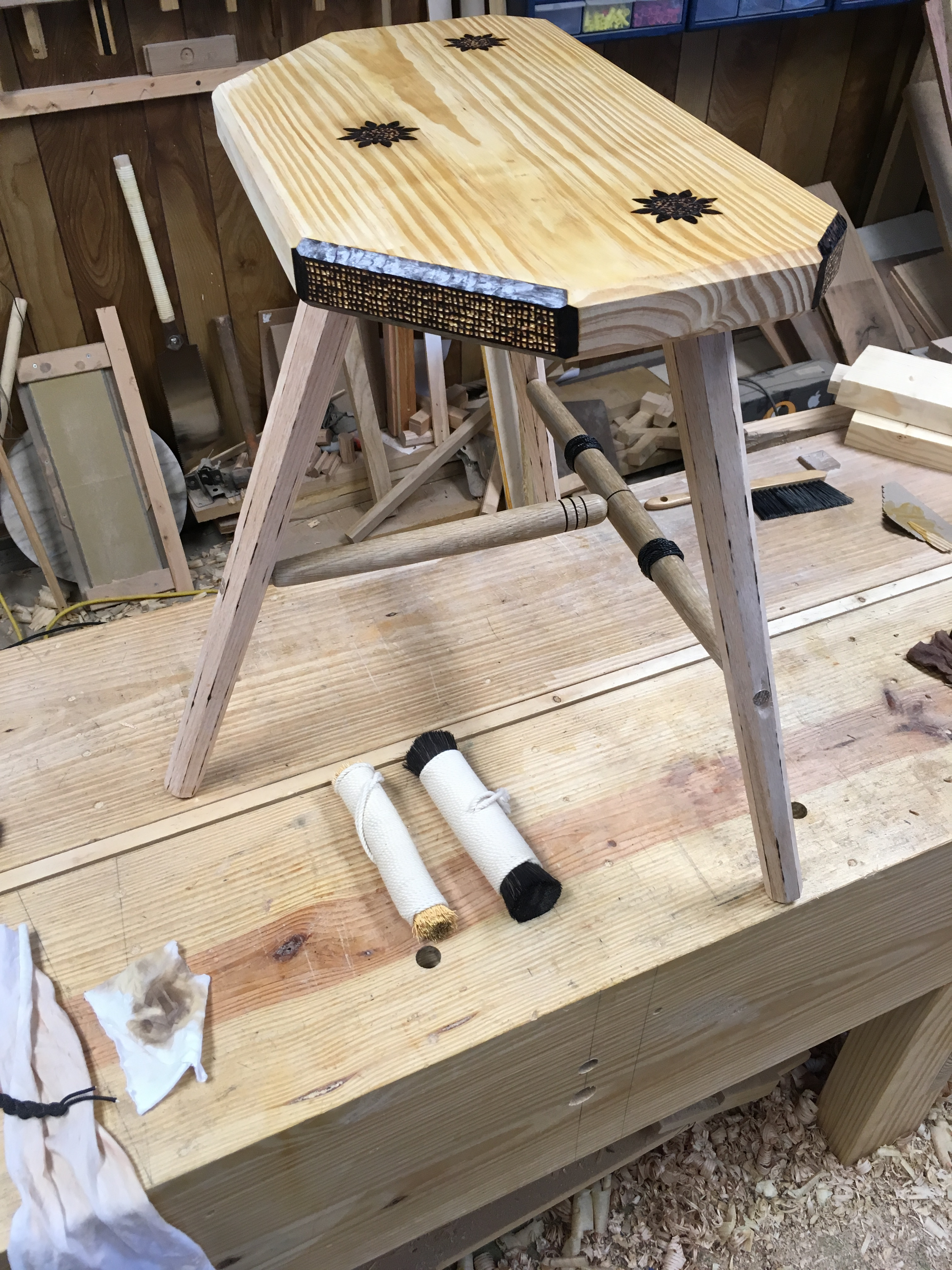 All that is left is assembly and to add my “decorative” embellishments. So I assembled the first stool (glue and wedges), stamped in some texture on the clipped corners and went at it with the wood burner. Finally, the seat received the uzukuri treatment.