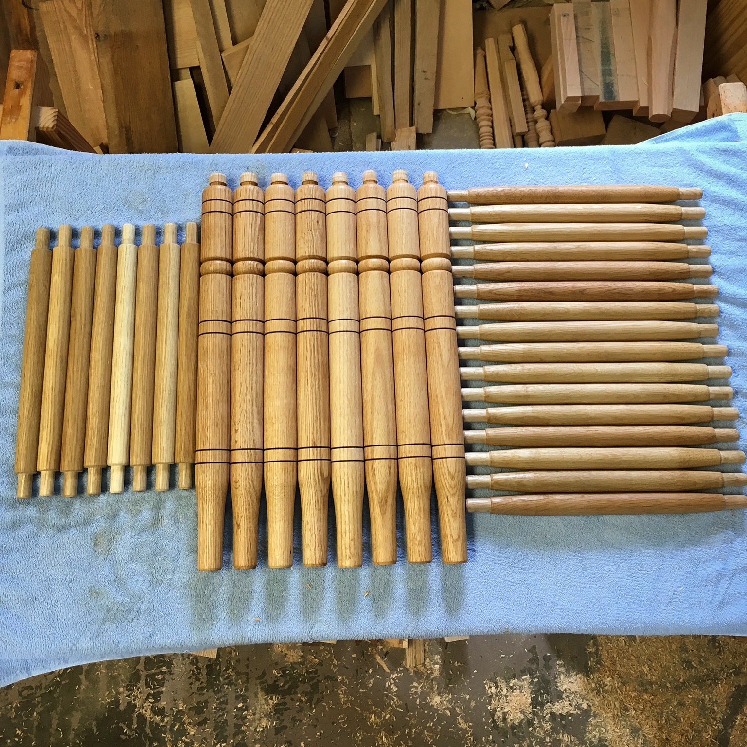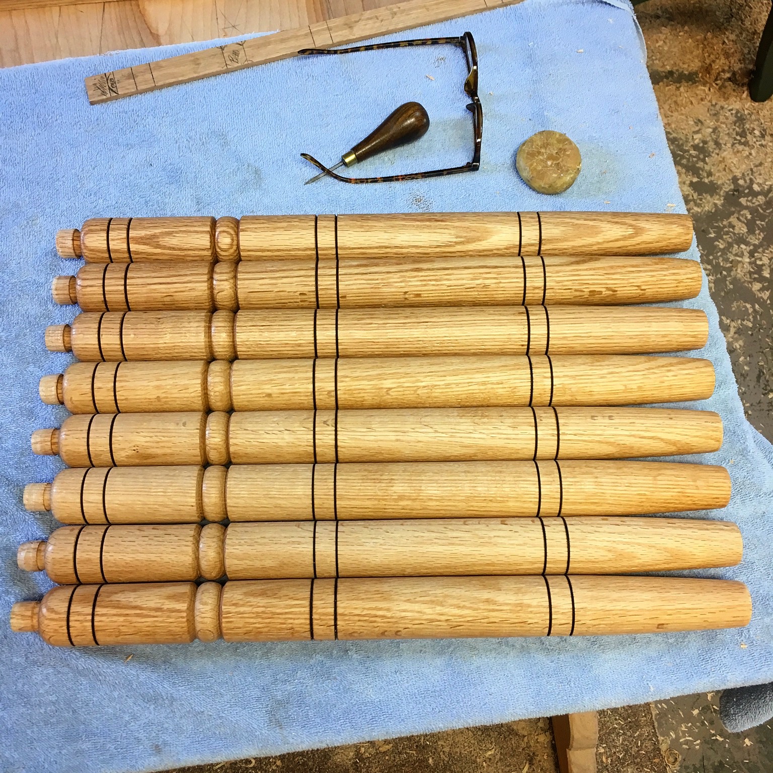 I managed to finish turning all eight of the legs (posts). These are close to final shape, but I’ll most likely chuck them back into the lathe and change the shape of the taper to the foot. I also completed the initial turning of all of the required rungs.