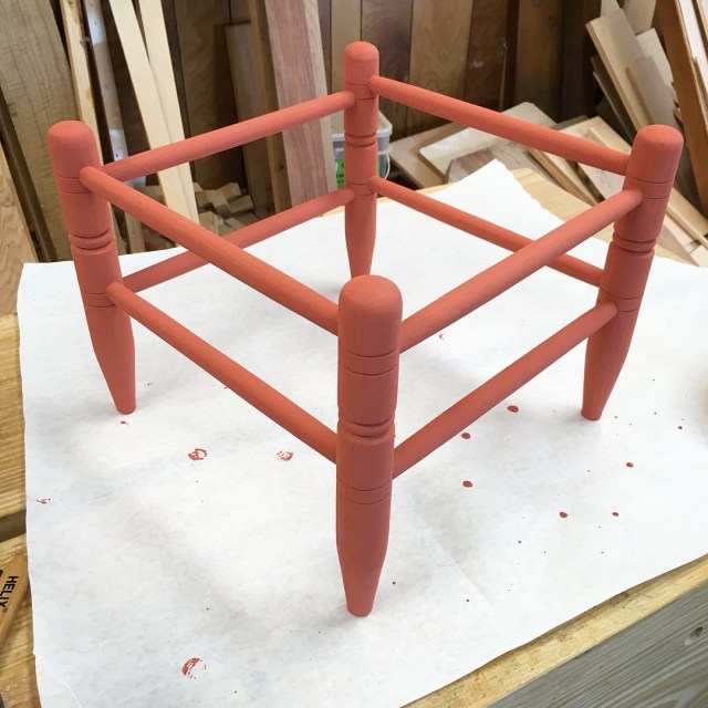 Since I still have plenty of salmon milk paint powder left from the chest of drawer project, that is what I’m painting this little stool with. After letting the glue set for a few hours I mixed up some paint and gave the stool a total of three coats.
