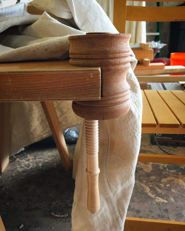 The version in the book has an addition turning upon which the actual pincushion is mounted. Its’s unclear from the book as to whether this was an additional piece or turned as one unit. Either way, I’m omitting it on this version and will be installing the pincushion directly on top of the barrel-shaped body. I turned a cove at the top edge specifically for the purpose. I struggled with the handle shape and length for this thing and ended up making yet another handle. The last operation of the day was to add the first coat of oil.