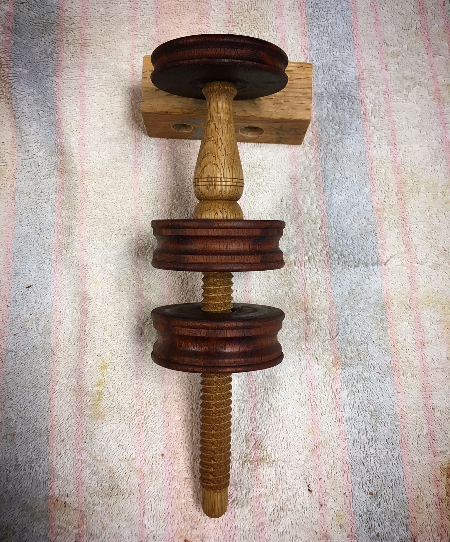 My tendency when building off-the-cuff is to keep my head down and fully engaged. This instance was no different, so I’m light on photos. At any rate, the tuning of the mahogany into the barrel shape and subsequent drilling, tapping and removal of the center section went smoothly. I used another piece of maple to turn and thread a slightly more svelte handle than my initial version. By the end of afternoon I had the thing together and working.