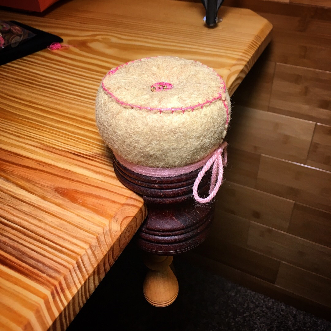 I did manage to finish the first version. I even made the pincushion myself. Although my sewing ability is a bit lacking and I ended up taking it apart and redoing it.