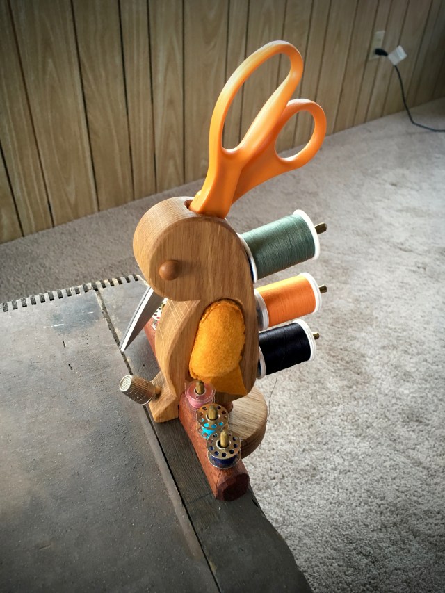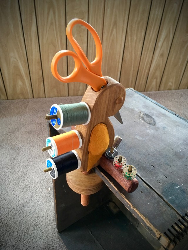 The general idea is that it is a bird theme. The head holds the scissors, there are pegs down its back to hold thread spools, there is a peg at its feet to hold a thimble and the wings form the pincushion. Management suggested that it should also hold sewing machine bobbins and I added that feature by putting the bird on a perch. The whole thing clamps on the edge of a table in the same manner as the second version of clamp-on pincushions.