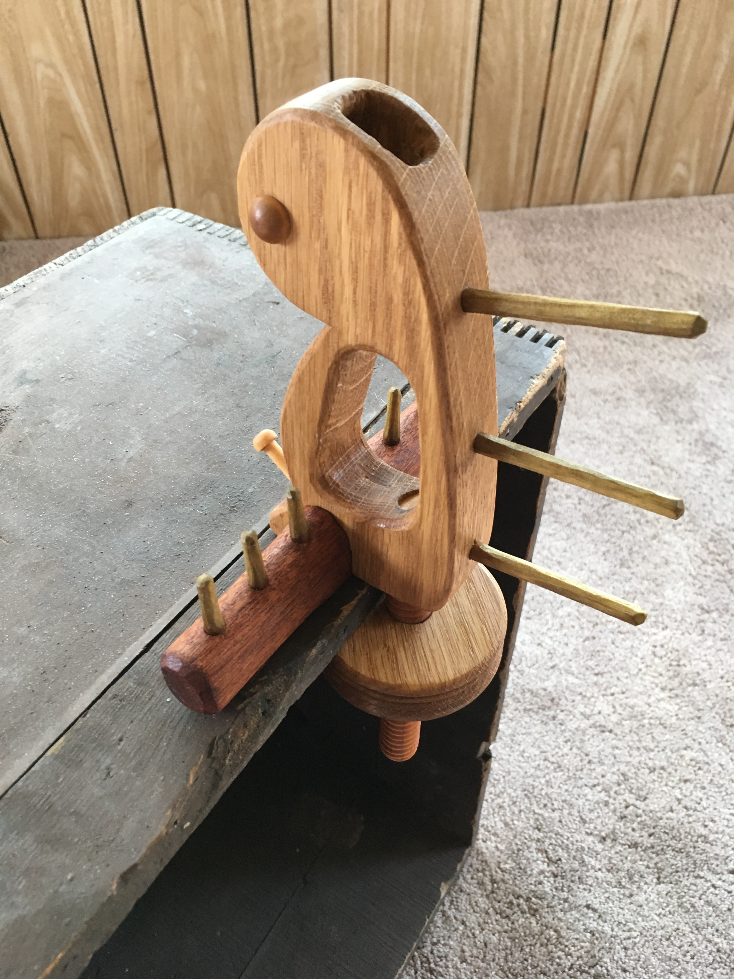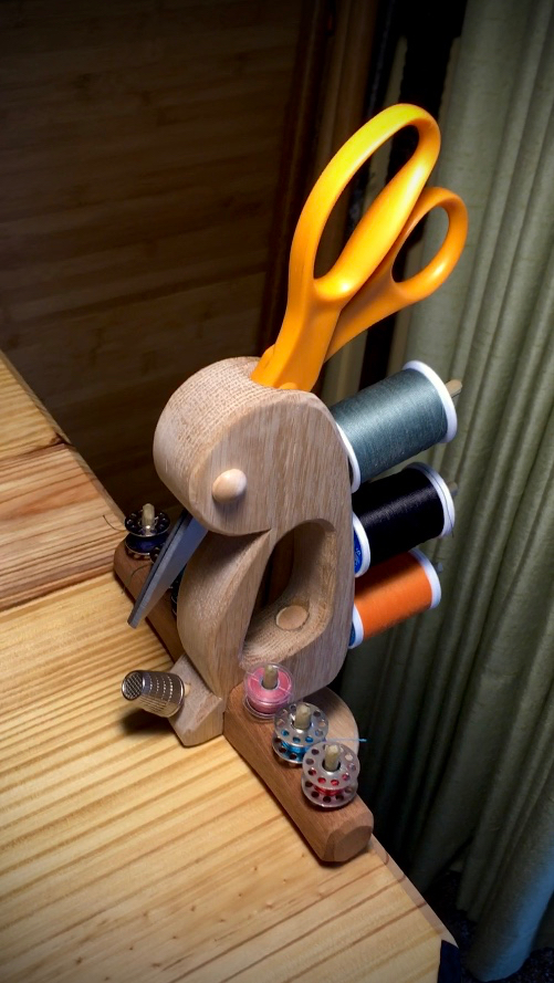 The general idea is that it is a bird theme. The head holds the scissors, there are pegs down its back to hold thread spools, there is a peg at its feet to hold a thimble and the wings form the pincushion. Management suggested that it should also hold sewing machine bobbins and I added that feature by putting the bird on a perch. The whole thing clamps on the edge of a table in the same manner as the second version of clamp-on pincushions.