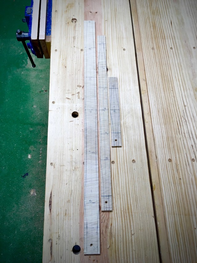 Anyway, the only progress on this build, other than the design drawing, is that this evening after work I made some pattern sticks for the legs and stretchers.