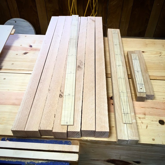I managed to mill up some of the parts the sewing table. I ripped some 8/4 red oak stock down for the legs and a few white oak bits for the stretchers. My setup for breaking down stock is pretty basic, bordering on the sketchy. I have an old Craftsman job site table saw. No guards, no stand. I just drag it out into the middle of the floor and squat down to run stock through it. It’s a crappy way to go, but it works. For an outfeed stand I use one of my Japanese trestles. I purposely set the lower stretcher height just for that use.