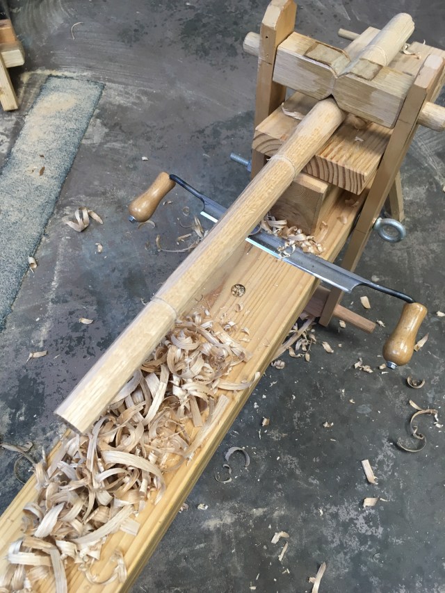 The next step was to take the leg stock to the shaving horse and knock off the corners to bring them to a rough round. The more material I can hog off with the drawknife the easier the lathe work will be.