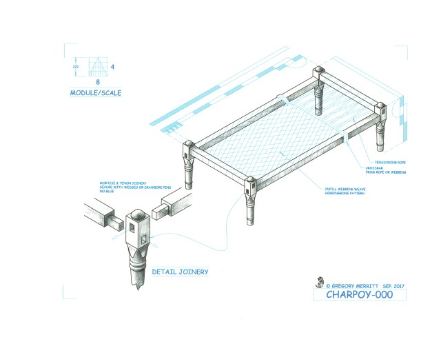 The charpoy (trans. four footed), charpaya, charpai or manji is a bed frame originating in the Indian subcontinent. Traditionally made of wood or bamboo (modern variants use metal) consisting of four legs and four rails typically joined with mortise and tenon joinery. The platform (infill) is created be weaving rope or webbing in a wide variety of patterns. Ranging from the simple and crude to the highly refined and decorated and serves as bed, couch, table, drying rack and for whatever other need arrises.