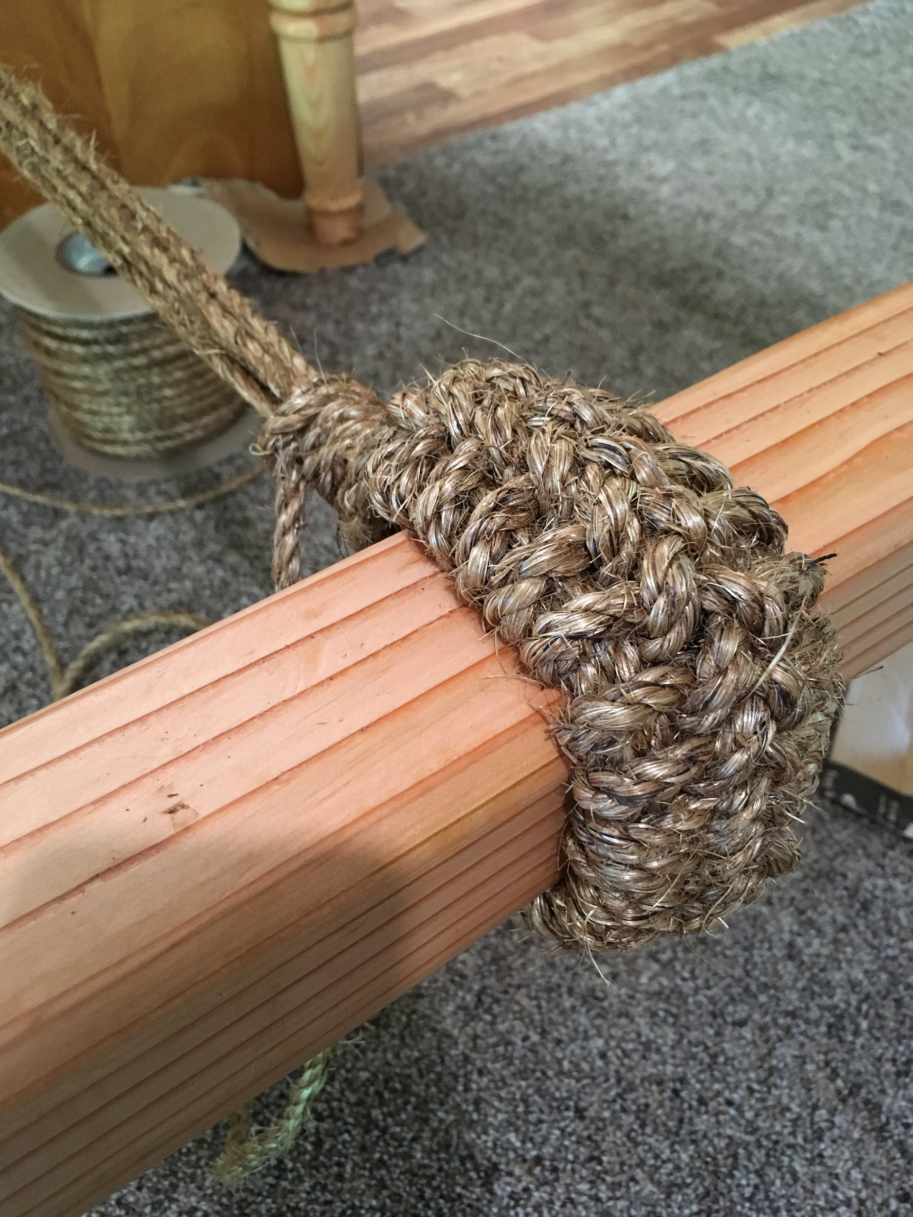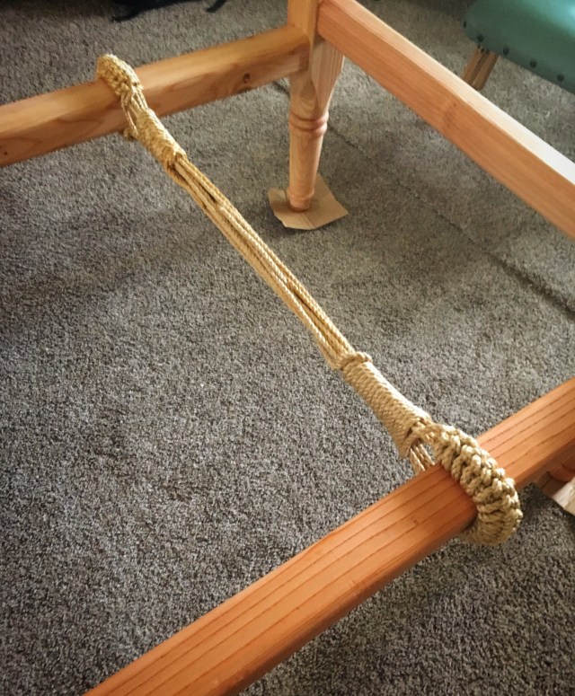 I began the actual weaving by construction the “crossbar” that is the anchor point between the weave and the tensioning ropes. This I made from 1/4” Manila rope. The bits that wrap around the rails looks complicated, but it really is just a series of half hitches.
