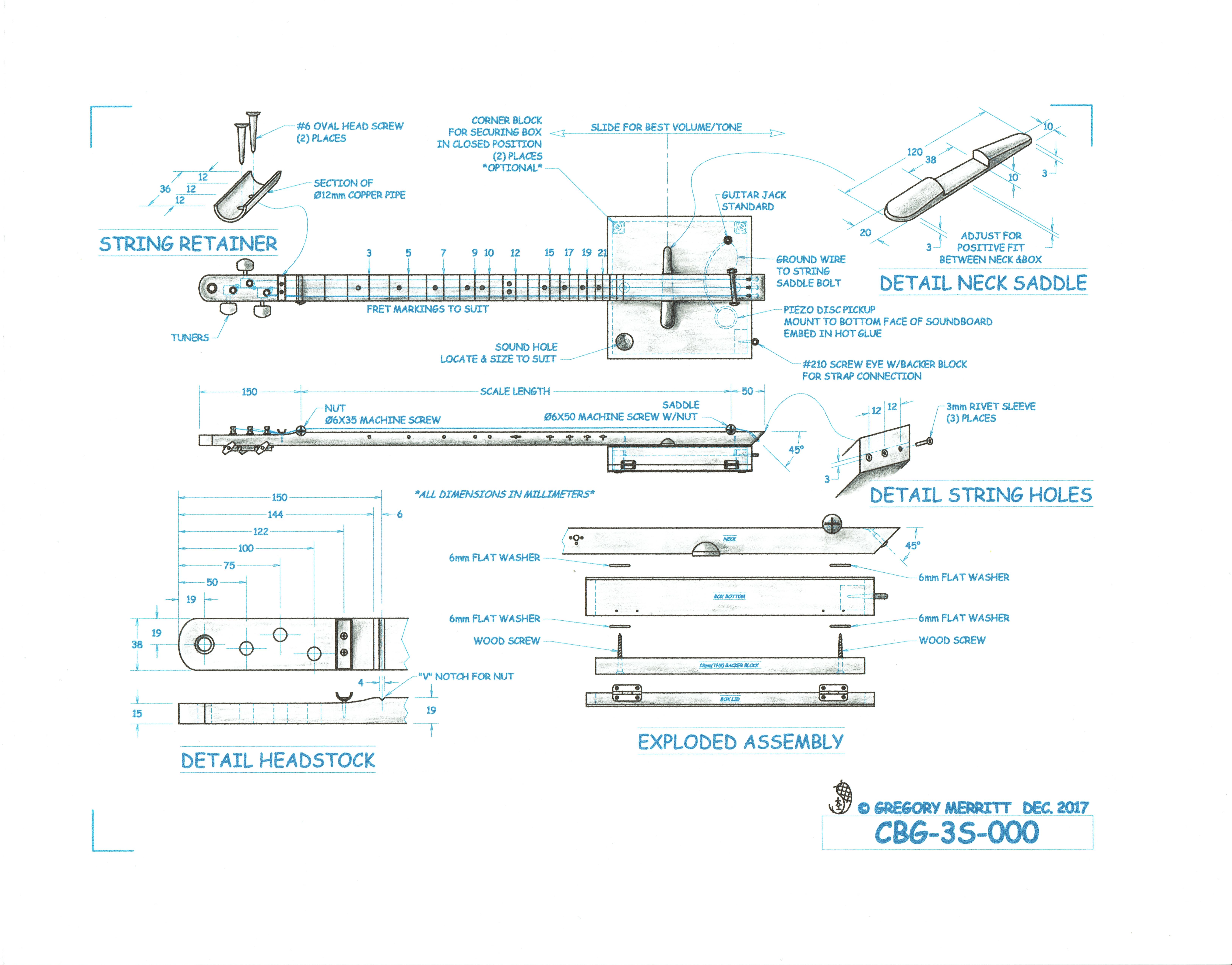 The goal from the start was to use a design that was easy to execute with a minimal tool set, was quick to build and had an acceptable musical sound. The hope was that those receiving one of my cigar box guitars would enjoy it, but also be inspired to explore and build their own versions. A complicated build, while possibly impressive, would be off-putting to many and do little to encourage them to build their own versions.