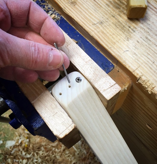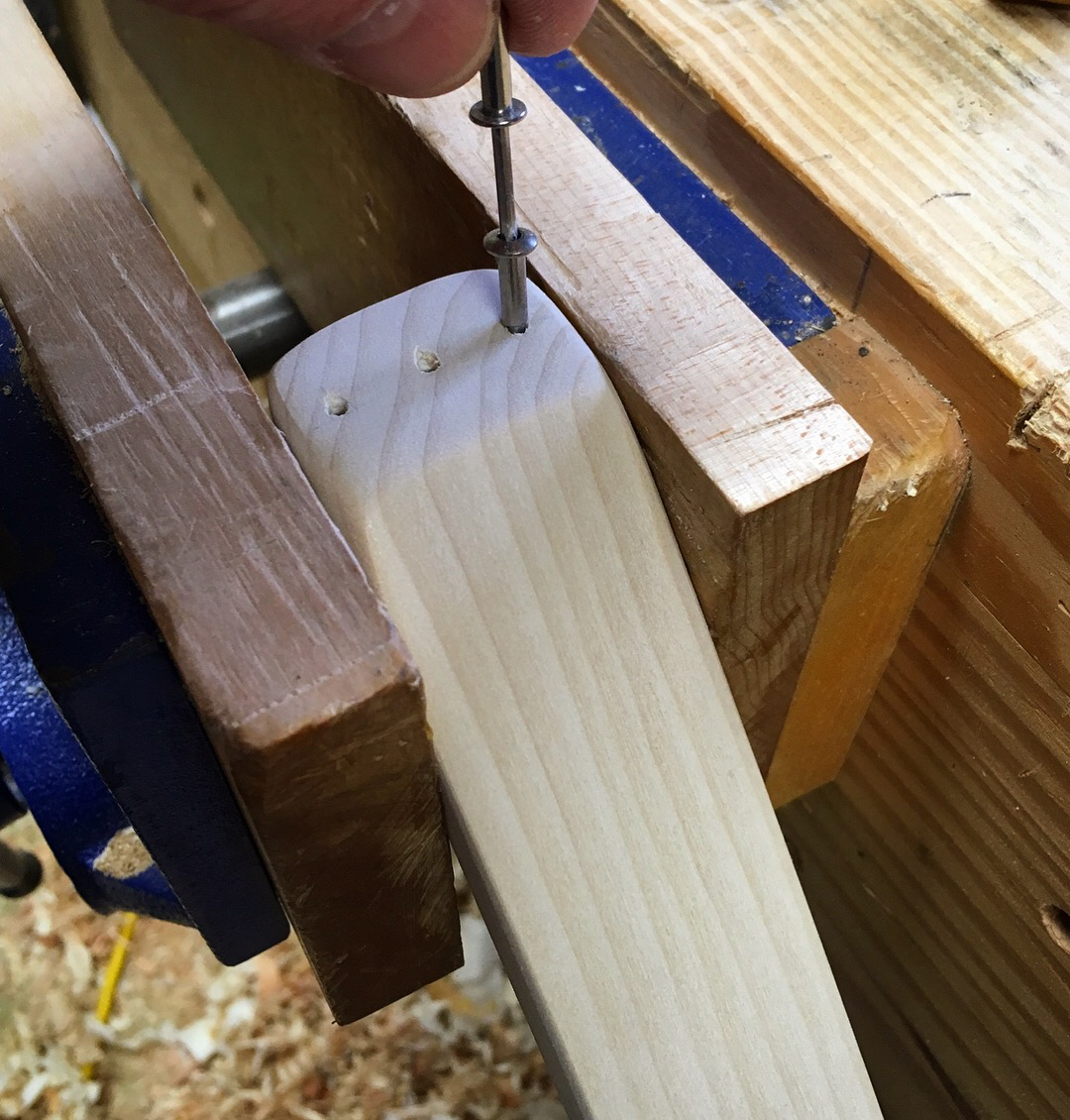 At the other (saddle) end of the neck the needs to be a way to secure the strings. I cut the end of the neck at 45deg and drilled three holes through which the strings will be threaded. To strengthen the bearing surface and prevent the strings from digging into the wood I added stainless steel rivet sleeves. Simply knock out the rivet pin and drive the sleeve into a friction fit hole.