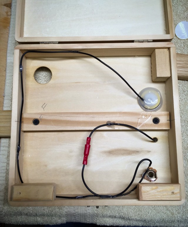 I also added an electric pickup. These are inexpensive piezo disks and I bought them prewired to a standard 1/4″ guitar jack. Piezos work by converting any and all vibrations to an electrical signal and have a reputation of being harsh sounding and prone to feedback. Both are true, but can be mitigated. The neck on top arrangement helps to mitigate some of it. I further reduced the issues by mounting the piezo in a bed of hot glue. This acts as an insulator and dampens some of the vibrations that the piezo picks up and amplifies. Particularly the unwanted vibrations from handling the guitar.