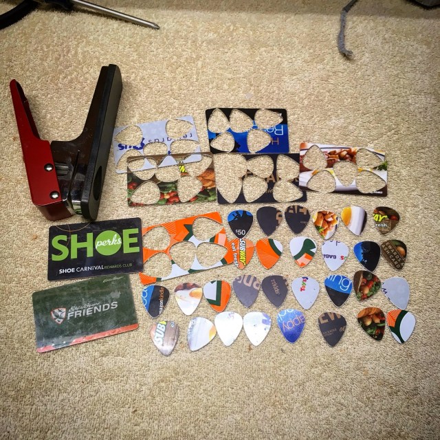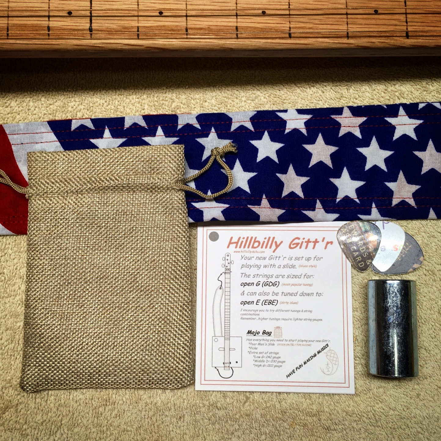 A cigar box guitar will never sound like a finely built instrument, but I am quite happy with what I achieved with such a simple arrangement. It is a lot of fun to play! All told, I ended up building fourteen of them for Christmas. Most were given as gifts and I even sold some. Everyone seemed to be thrilled with their new instrument. Each guitar that I gifted or sold was delivered with an information card, a strap fashioned from a bandanna, a slide and picks punched from old gift cards.