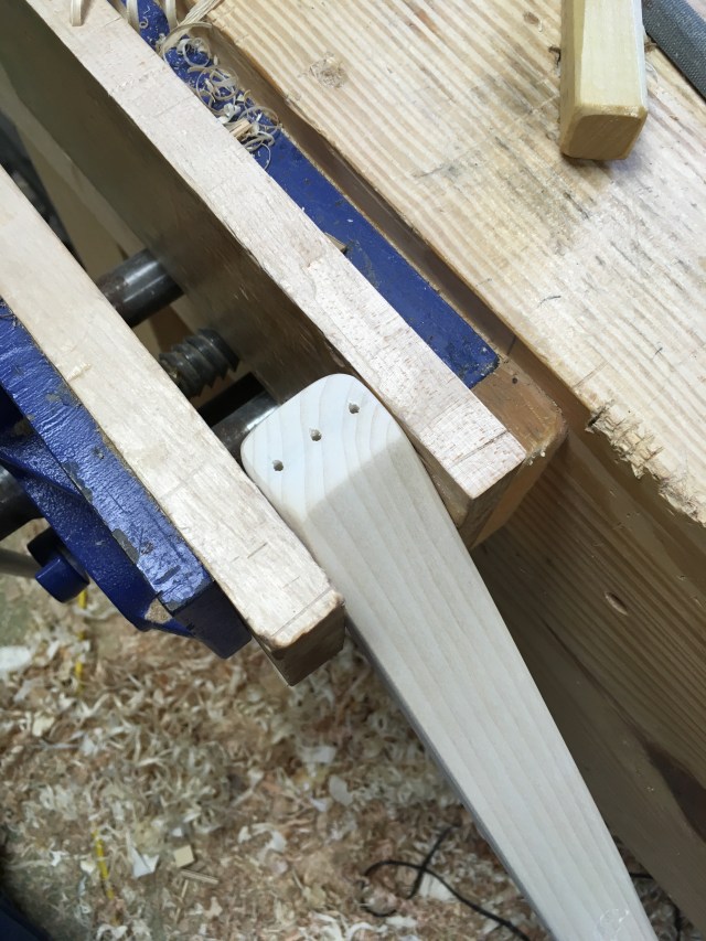 Once all of the elements for the scale and fingerboard are established, I turn my attention to the headstock. The headstock needs to be thinned down to about 5/8″ thick for mounting the tuning machines. I make quick work of this at the shaving horse with a drawknife. A little cleanup with a spokeshave and card scraper is all that is needed to complete the task.