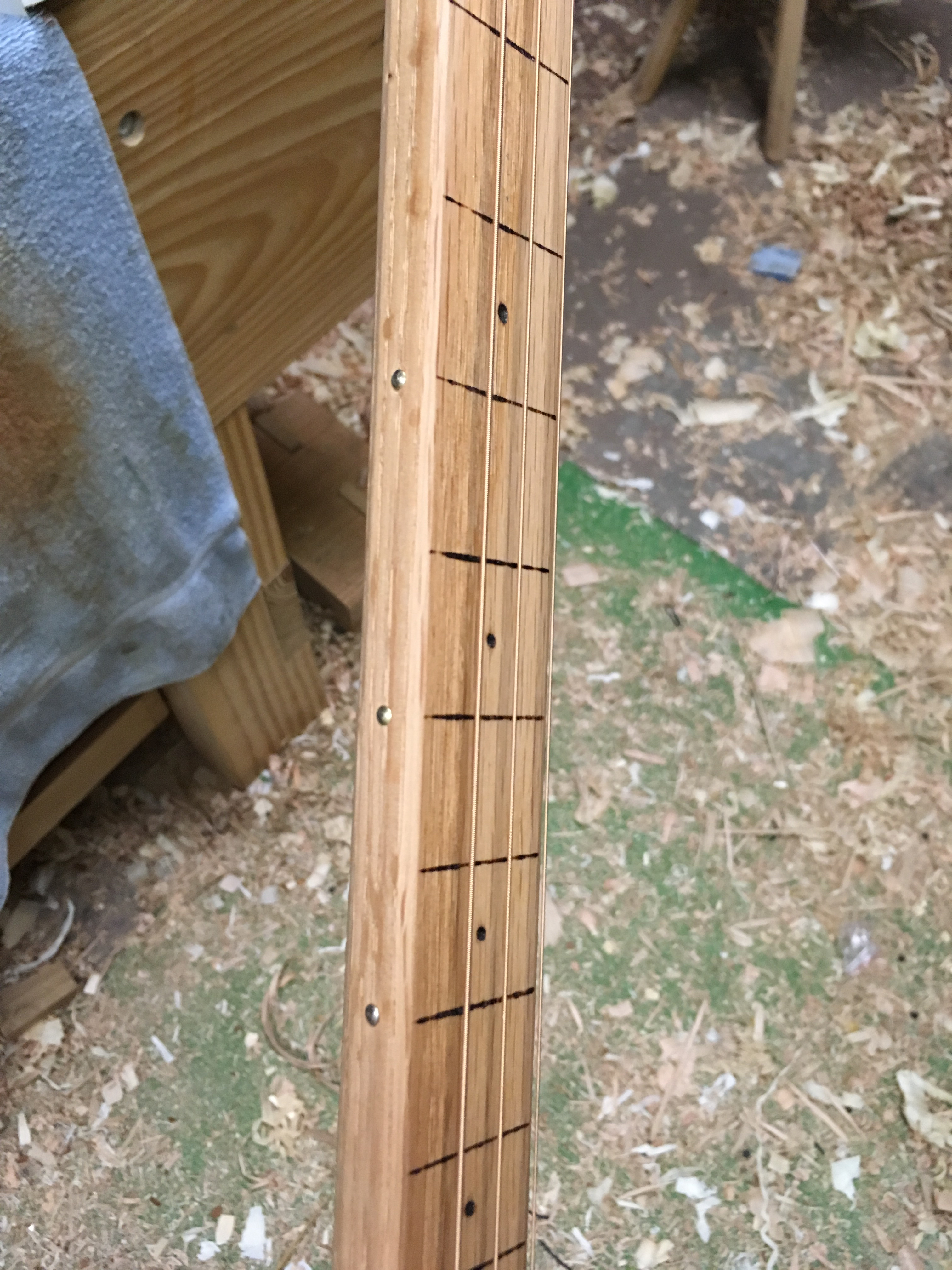 I also like to add the dot locators as you see on a standard guitar. On the “fretboard” I like to burn them in. Along the side of the neck I use gold-colored upholstery tacks and place them so they are in line with the actual fret location.