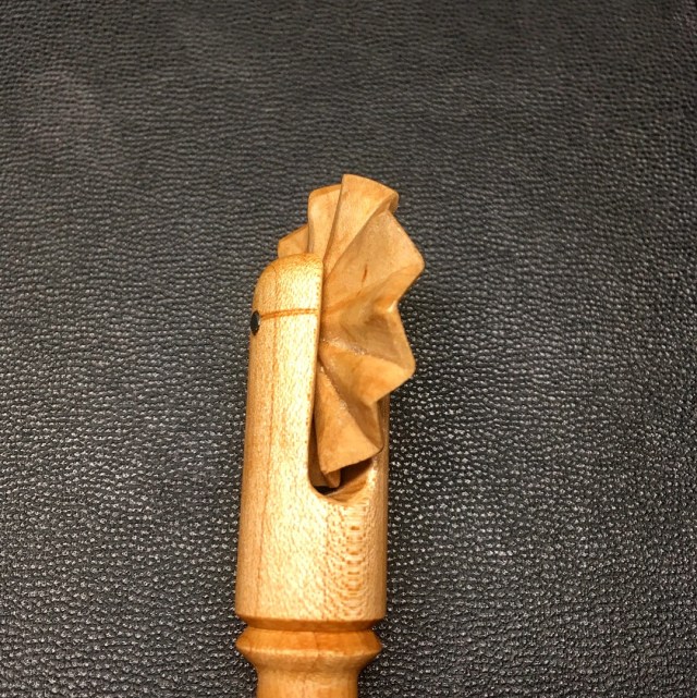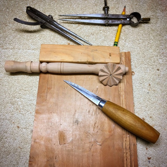 A simple turned handle and a wooden wheel for the business end. The handle is straight forward to turn on the lathe, but the wheel took a little work. I marked, then sawed out a circular disk. Then I filed it to round.