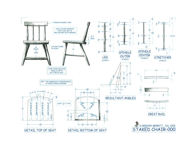 The reality is that I have been working my way up to this for a while.  Starting with staked tables, stools (staked and shaker) and even a couple of plywood contraptions that were chair shaped.  I’ve read the chapters on chairs in the “Anarchist’s Design Book” more times than I can count.  Watched the “No Fear Chair Making” video enough times to damn near recite the audio verbatim.  The same goes for Don Webber’s “Build a Welsh Stick Chair” video.