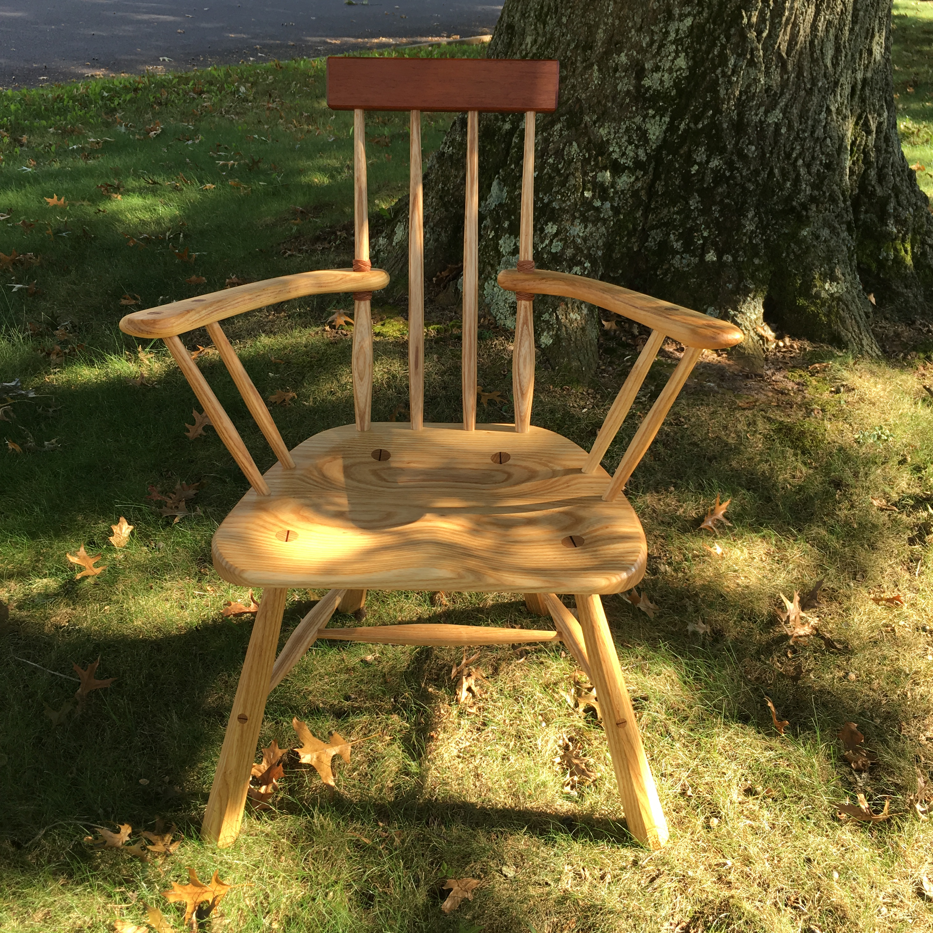 All ash save the mahogany comb/crest rail. Finished with linseed oil and beeswax.